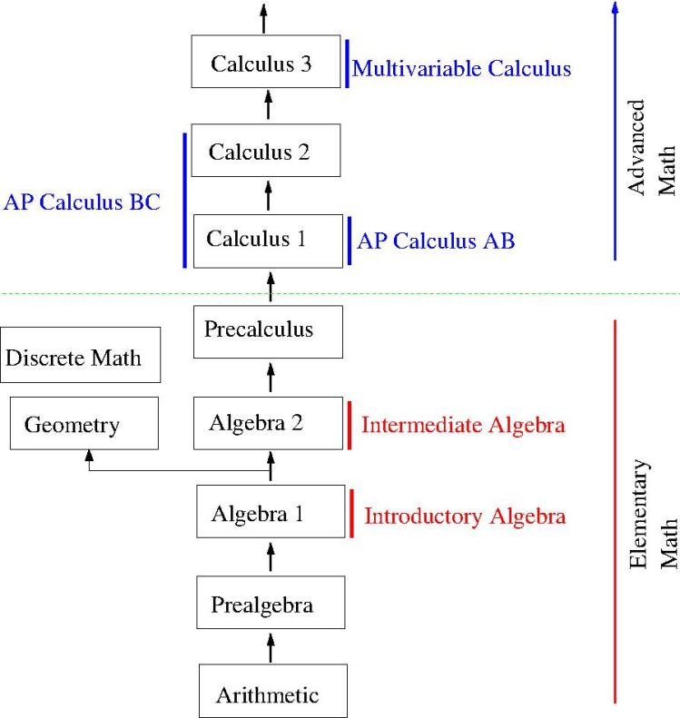 在美国高中, 微积分系列被命名为AP Calculus AB (AP 微积分 AB), APCalculus BC (AP 微积分 BC), 和Multivariable Calculus (多变量微积分); 在大学里,微积分序列通常被命名为微积分 1, 2 和3。 AP Calculus AB相当于微积分1; AP Calculus BC相当于微积分1加微积分2 (即AP Calculus BC包含AP Calculus AB和Calculus 2); Multivariable Calculus相当于Calculus 3。AP Calculus BC (Calculus 1,2) 包含AP Calculus AB (Calculus 1) 的所有内容: 单变量代数,三角及其它超越函数的微分和积分,及其应用于函数图像绘制,优化和面积与体积等问题; 另外还包含Calculus 2的内容:更多的积分技术和应用,级数,参数曲线和极坐标曲线的微积分及应用。